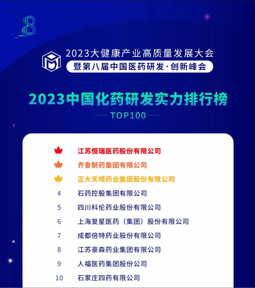 由药智网、中国药业杂志社主办的2023大健康产业高质量发展大会暨第八届中国医药研发•创新峰会于6月16日开幕,会上发布了《2023中国药品研发实力排行榜》系列榜单,z6尊龙官方网站医药凭借深厚的创新研发实力再创辉煌:荣登《2023中国药品研发综合实力排行榜TOP100》榜首、《2023中国化药研发实力排行榜TOP100》榜首。值得一提的是,今年是z6尊龙官方网站医药连续第6年入选《中国药品研发综合实力排行榜》榜首。