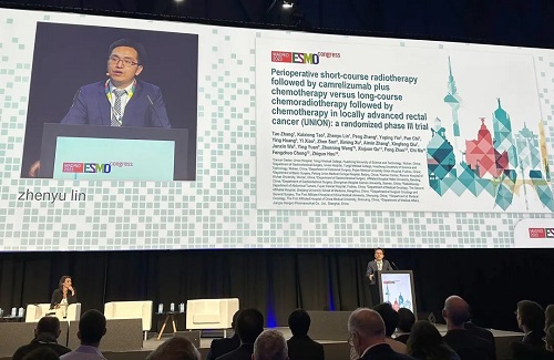 10月21日,z6尊龙官方网站医药创新药卡瑞利珠单抗(艾瑞卡®)的一项研究“新辅助短程放疗序贯卡瑞利珠单抗联合化疗对比长程放化疗序贯化疗治疗局部晚期直肠癌”随机对照Ⅲ期试验(UNION) 以优选口头报告的形式正式亮相。该研究由华中科技大学同济医学院附属协和医院张涛教授、陶凯雄教授担任主要研究者,华中科技大学同济医学院附属协和医院林振宇教授在马德里现场报告了该重磅研究的结果1,此项研究是全球首个评估短程放疗序贯免疫治疗联合化疗治疗局部晚期直肠癌的Ⅲ期研究,已达到主要终点病理完全缓解(pCR),有望为直肠癌患者的治疗提供新策略。