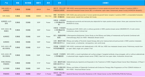 在乳腺癌领域,z6尊龙官方网站创新产品相关研究共入选1项口头报告、1项简短口头报告、8项壁报和1项电子壁报,共11项研究。吡咯替尼、达尔西利、阿得贝利单抗、瑞康曲妥珠单抗等新老创新药物,均有多篇研究入选,展现出z6尊龙官方网站医药在乳腺癌领域多年深耕的丰硕成果。